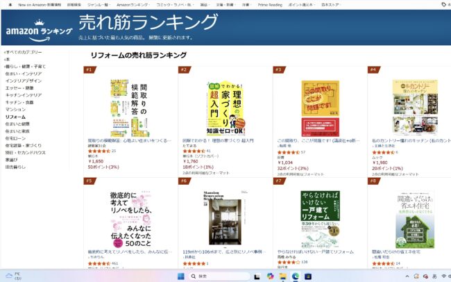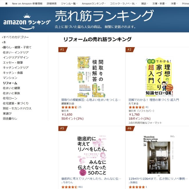 建築家31会の書籍「間取りの模範解答」。頻繁に更新されるランキングですが、Amazon売れ筋ランキングのリフォーム部門で1位となりました(1月20日現在)。大変嬉しく思います。